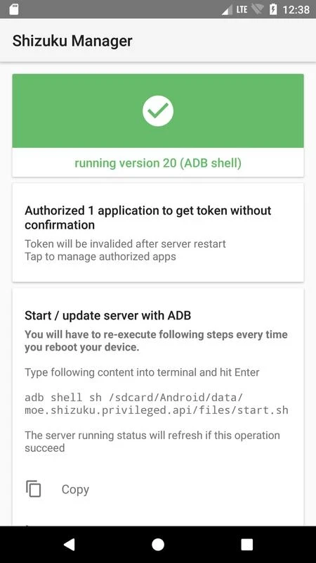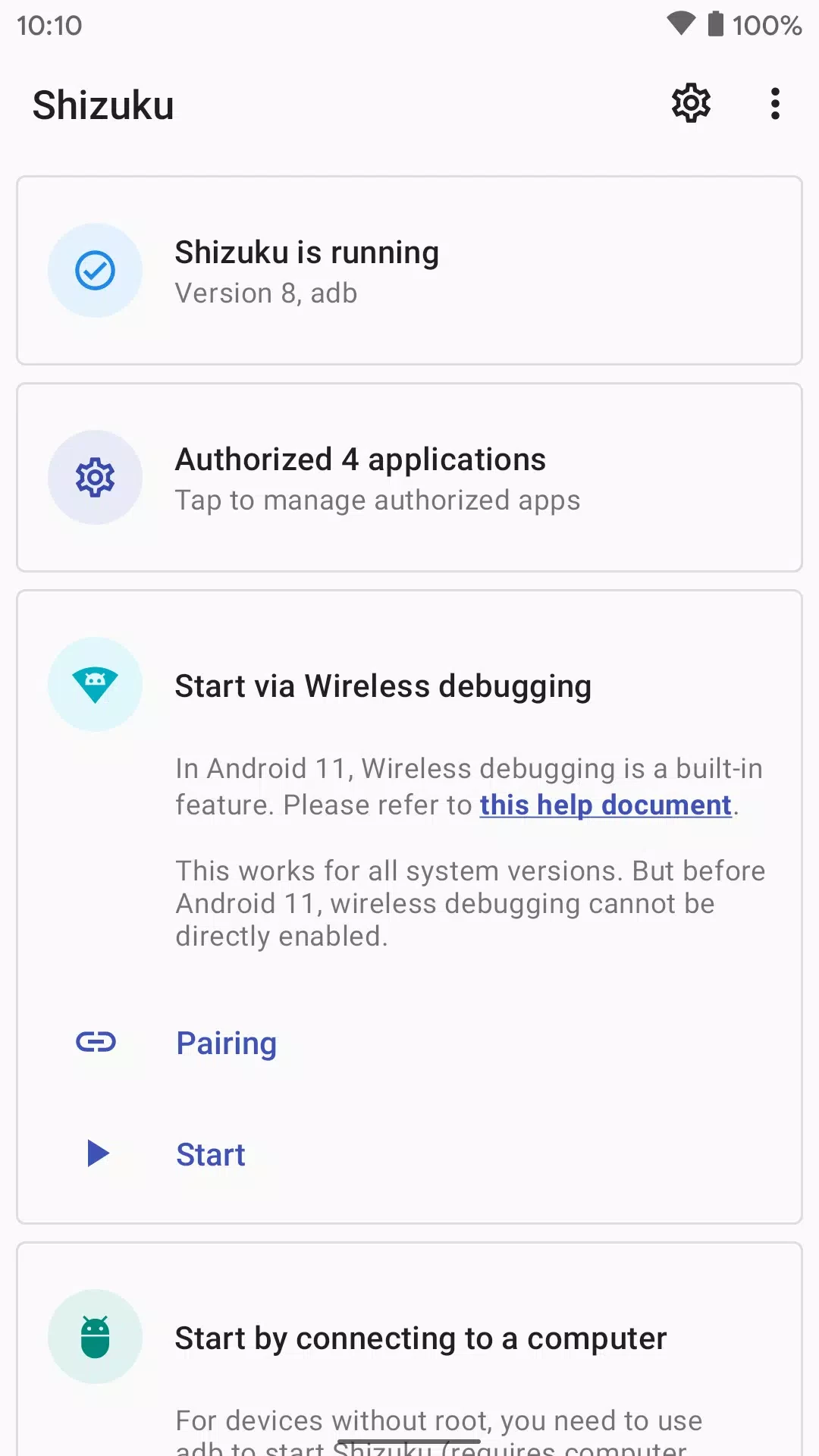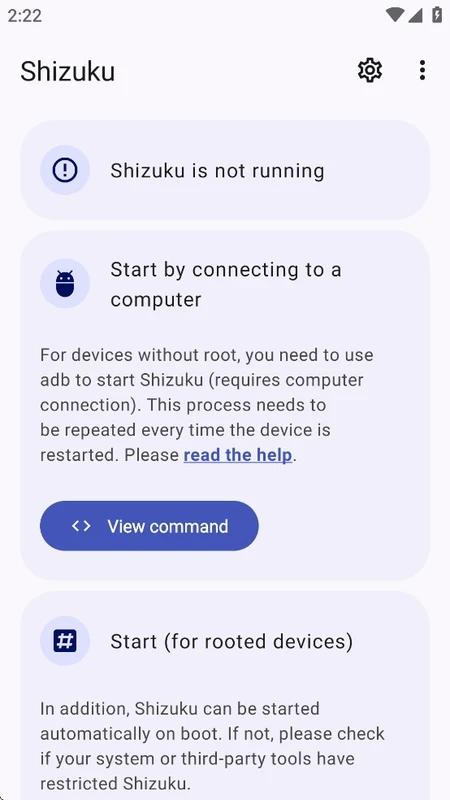 O aplicativo oferece dois métodos para iniciar o servidor Shizuku: ADB para uma configuração sem root ou com root, se disponível. Reiniciar o dispositivo inicia rapidamente o modo ADB. Já com root, as reinicializações são fáceis e você pode escolher o método de acordo com suas necessidades.
